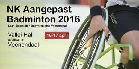 De NK Aangepast Badminton 2016 wordt op zaterdag 16 en zondag 17 april georganiseerd door Badminton Nederland in samenwerking met Badminton Duovereniging Veenendaal.