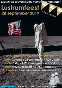 Badminton Duovereniging Veenendaal bestaat 50 jaar! Dat moet natuurlijk gevierd worden. Daarom organiseren wij op zaterdag 28 septermber as. een Lustrumfeest voor alle leden en oud-leden van de vereniging.