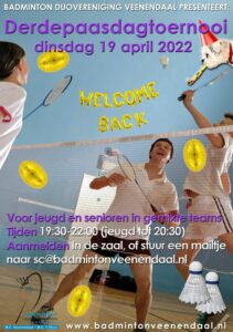 Hierbij nodigen we je uit voor het allereerste BDV Derdepaasdagtoernooi op dinsdagavond 19 april 2022, van 19:30-22:00. Gewoon omdat het kan en omdat we blij zijn dat we na alle lockdowns en maatregelen de afgelopen tijd weer gewoon in de zaal kunnen badmintonnen met elkaar. Het toernooitje is voor al onze jeugd- en seniorleden.