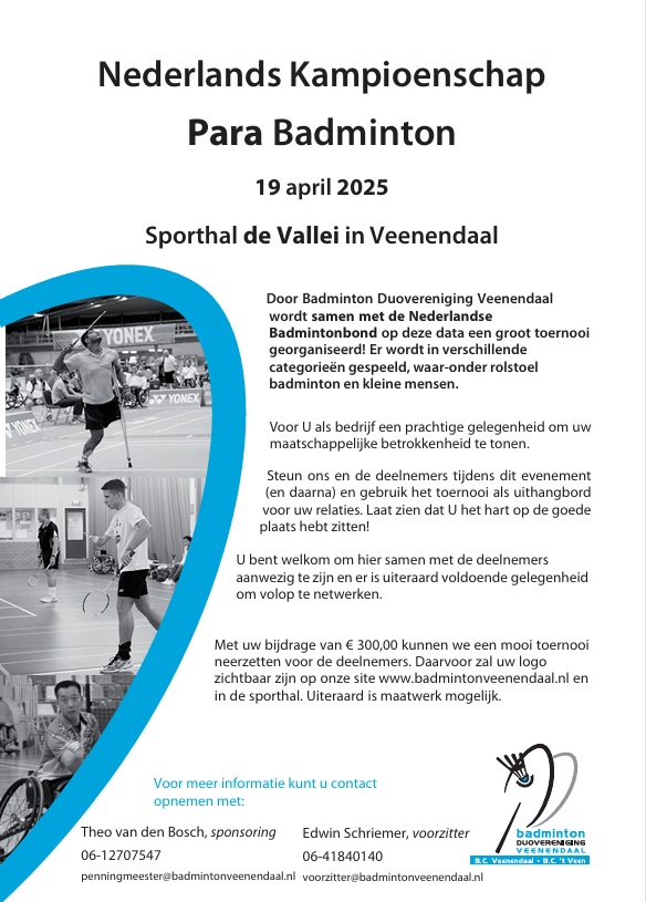 Je bent hier: Badminton Duovereniging Veenendaal > Nieuws > Badminton Nederland > Nederlands Kampioenschap Para Badminton 19 april 2025